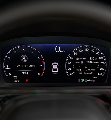 تم تزويد سيارة Accord بتقنية Honda SENSING™ التي تتضمن مجموعة متكاملة من تقنيات السلامة الفائقة والتقنيات المساعدة للسائق. هذه التقنية مُصممة لتزويدك بتجربة قيادة أسهل وأكثر أمانًا بما يضمن توفير أعلى مستويات الحماية والسلامة لجميع ركاب السيارة. يتميز نظام Honda SENSING™ بأنه قابل للتخصيص بالكامل وذلك عن طريق العداد المزود بشاشة بتقنية TFT. تُظهر شاشةTFT السيارات التي يتم اكتشاف وجودها أثناء استخدام نظام تثبيت السرعة المُتكيِّف مع تقديم بيانات آنية.
