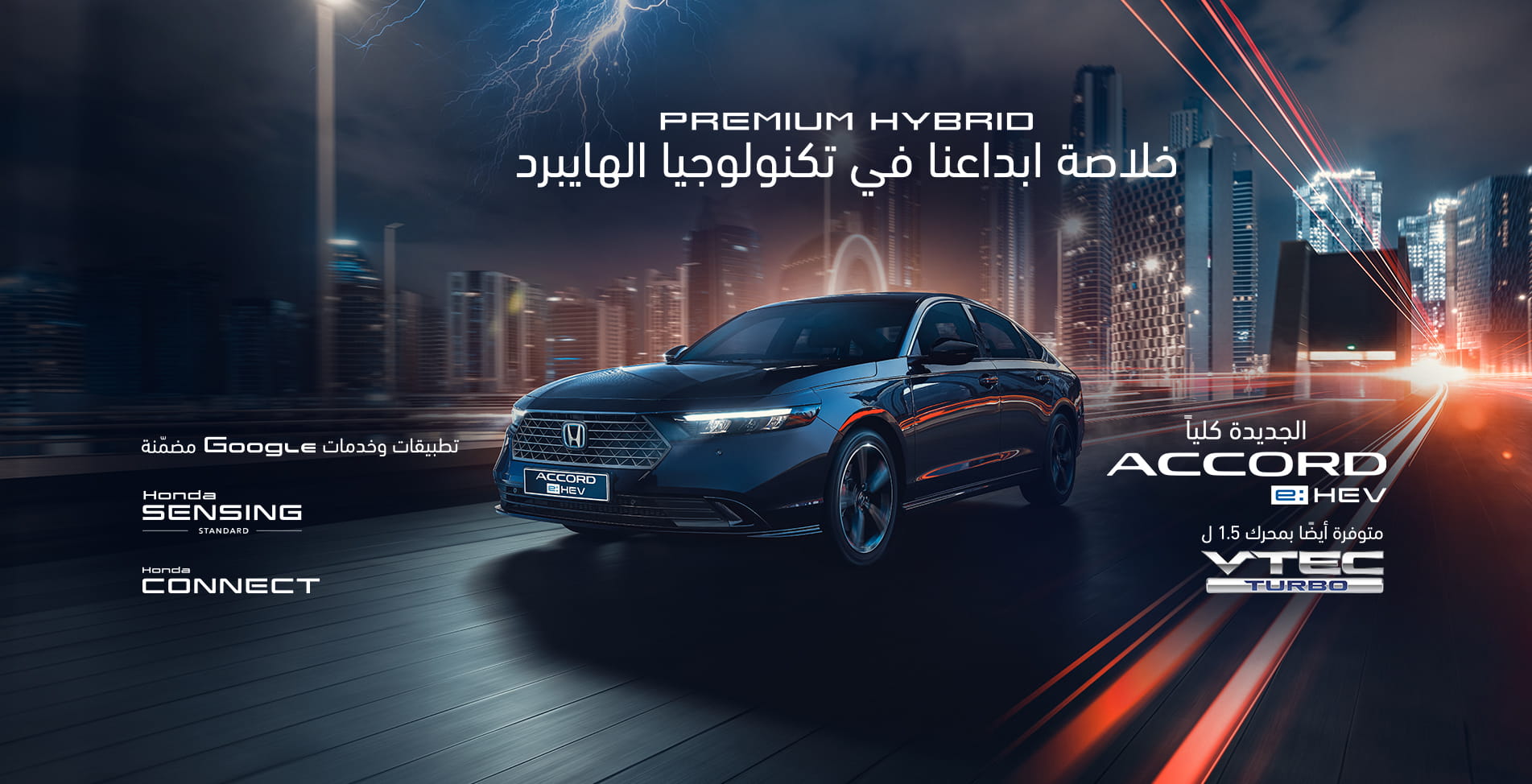 عند الحديث عن مستويات الراحة العالية والقيادة الديناميكية الانسيابية في عالم السيارات، فلا شك أن أول ما سيتبادر إلى الأذهان هي سيارة Accord. تتميز ال Accord الجديدة كليًّا بمظهر أنيق ورياضي ذي تصميم خارجي لافت للنظر وتصميم داخلي مُنظَّم يسهل استخدامه. كما أنها مزودة ، بنظام كهربائي هجين متطور يُوفر للمستخدم تجربة قيادة أكثر إثارة. فيما يتعلق بتقنيات الاتصال في السيارة فقد وصلنا بها إلى مستويات غير معهودة من التقدم والسلاسة، والفضل في ذلك يعود إلى خدمات Google المُضَمَّنة وخدمات CONNECTED التي توفر مزايا سهلة الاستخدام مع إمكانية الوصول إلى خدمات Google أينما كنت. وفيما يخص أنظمة السلامة ومساعدة السائق، فإن ال Accord مزودة بأحدث تقيات السلامة على الإطلاق، وهي من المميزات القياسية في جميع فئات السيارة.