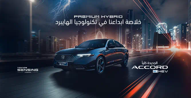 عند الحديث عن مستويات الراحة العالية والقيادة الديناميكية الانسيابية في عالم السيارات، فلا شك أن أول ما سيتبادر إلى الأذهان هي سيارة Accord. تتميز ال Accord الجديدة كليًّا بمظهر أنيق ورياضي ذي تصميم خارجي لافت للنظر وتصميم داخلي مُنظَّم يسهل استخدامه. كما أنها مزودة ، بنظام كهربائي هجين متطور يُوفر للمستخدم تجربة قيادة أكثر إثارة. وفيما يخص أنظمة السلامة ومساعدة السائق، فإن ال Accord مزودة بأحدث تقيات السلامة على الإطلاق، وهي من المميزات القياسية في جميع فئات السيارة.