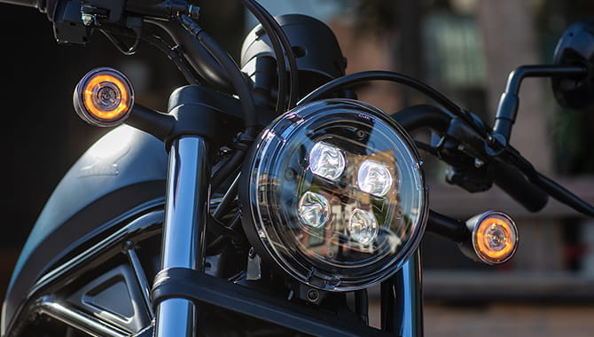 The rigid, low-slung tubular steel frame is central to Rebel style and hugely complemented by 16-inch diameter cast aluminium wheels with fat, 130/9-16 and 150/80-16 front and rear tyres. For a stripped-down look the pillion footpegs and rear seat pad quickly unbolt. 41mm telescopic front forks are matched to spring preload- adjustable, nitrogen-charged shock absorbers, for a compliant and supple ride; both front and rear discs are controlled by two-channel ABS, for confident braking in all conditions.
