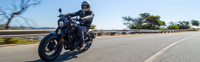 The rigid, low-slung tubular steel frame is central to Rebel style and hugely complemented by 16-inch diameter cast aluminium wheels with fat, 130/9-16 and 150/80-16 front and rear tyres. For a stripped-down look the pillion footpegs and rear seat pad quickly unbolt. 41mm telescopic front forks are matched to spring preload- adjustable, nitrogen-charged shock absorbers, for a compliant and supple ride; both front and rear discs are controlled by two-channel ABS, for confident braking in all conditions.