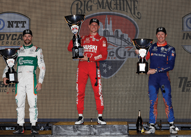 James Hinchcliffe (#29 Andretti Autosports Honda) Finished third, first podium result of 2021: "Thanks to all the fans coming out today, and sticking it out through the cautions and red flags. By the end, it was getting hard to see with the sun going down and a dark visor! But for us, after we got caught up in that early [multi-car collision], my guys called a great strategy to pit when we did. We've had a rough year, and have had a lot of things go against us. So I'm really happy things went our way today here in Nashville. It's nice to be back on the podium."