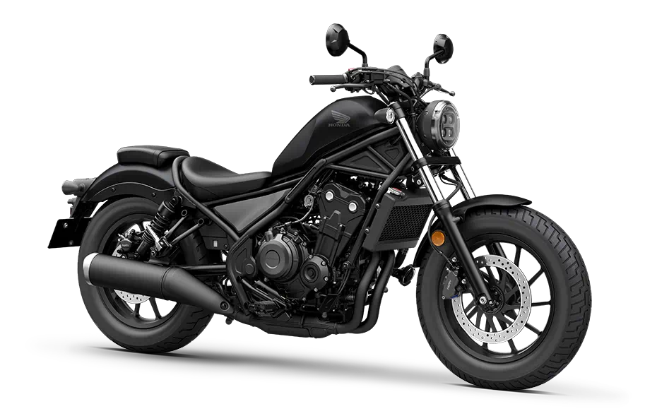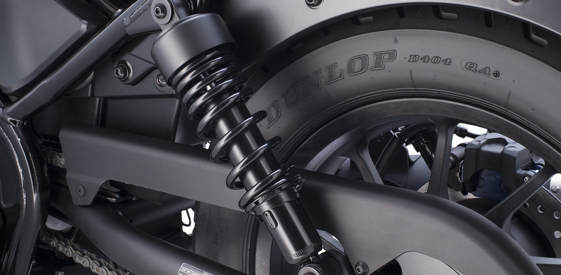 The rigid, low-slung tubular steel frame is central to Rebel style and hugely complemented by 16-inch diameter cast aluminium wheels with fat, 130/9-16 and 150/80-16 front and rear tyres. For a stripped-down look the pillion footpegs and rear seat pad quickly unbolt. 41mm telescopic front forks are matched to spring preload- adjustable, nitrogen-charged shock absorbers, for a compliant and supple ride; both front and rear discs are controlled by two-channel ABS, for confident braking in all conditions.