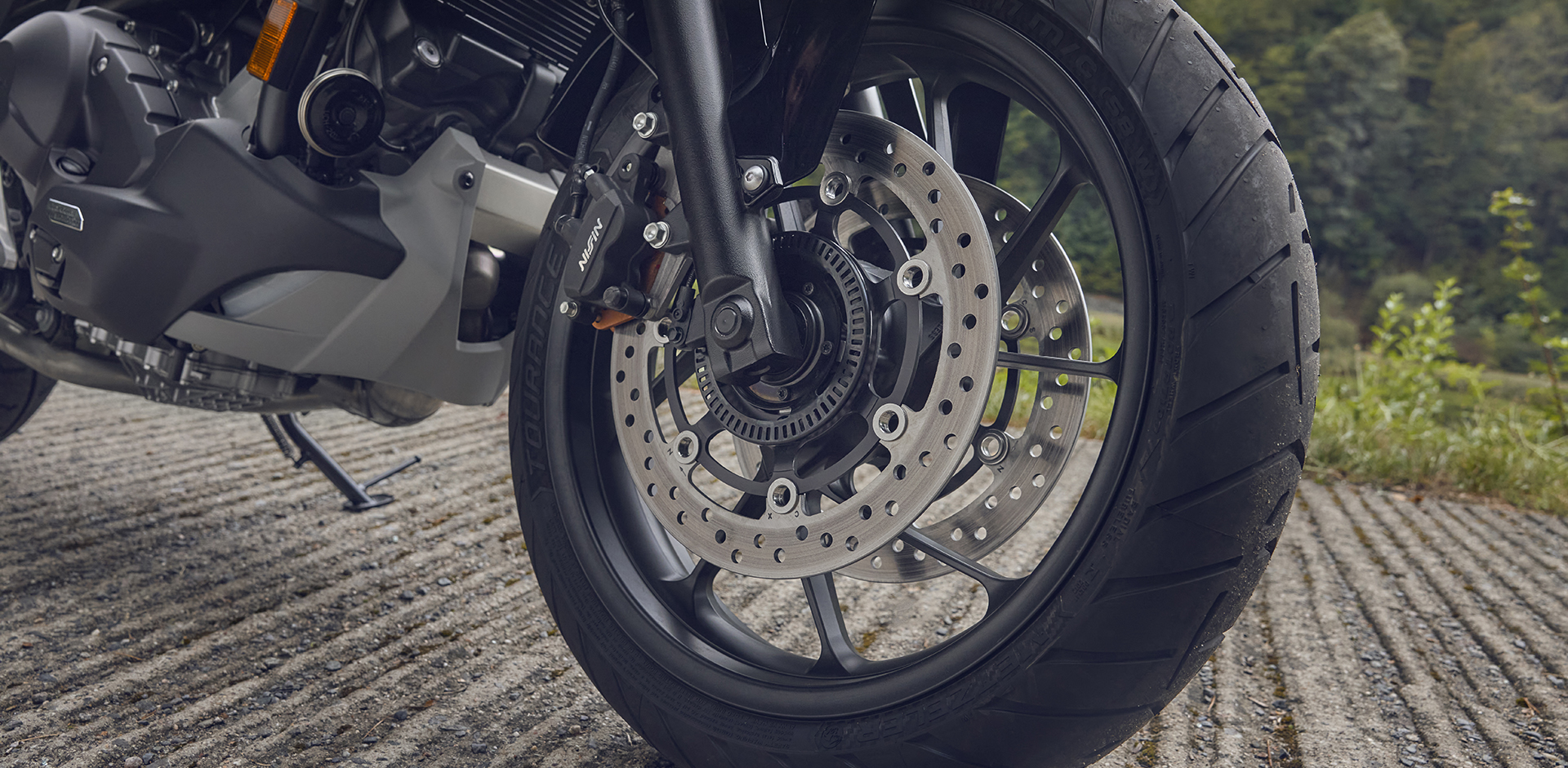 The 41 mm Showa Dual Bending Valve (SDBV) front forks provide supple bump absorption, large or small and the rear Pro-Link® rear monoshock features spring preload adjustment. Powerful, smooth braking performance is delivered by a twin-piston caliper and 320 mm wavy disc up front, matched to a rear single-piston caliper, 240 mm disc and two-channel ABS.