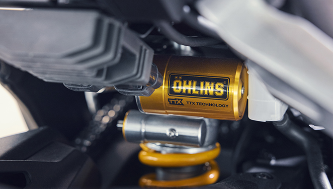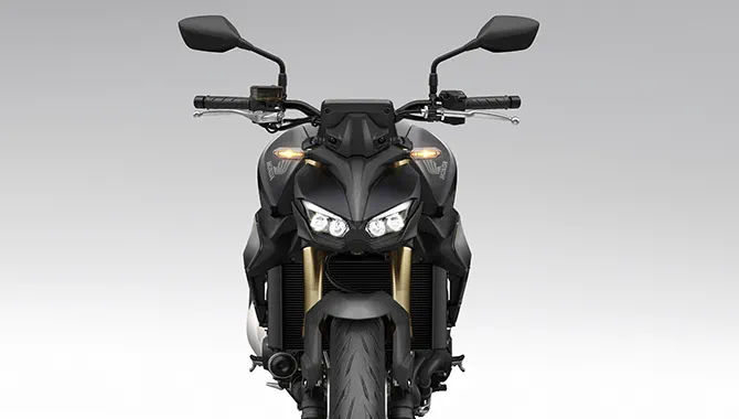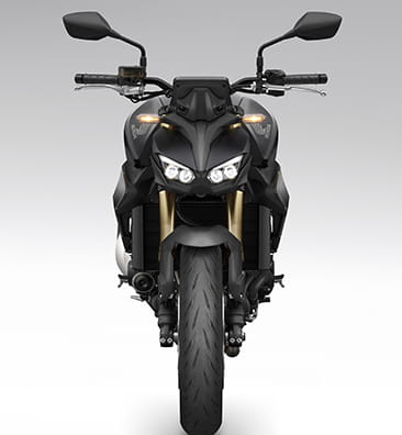 Les doubles projecteurs LED percent l’horizon sous un carénage avant compact.
