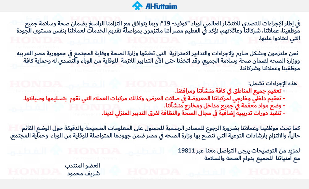 نحن ملتزمون وبشكل صارم بإلاجراءات والتدابير الاحترازية التي تطبقها وزارة الصحة ووقاية المجتمع في جمهورية مصر العربيه ووزارة الصحه لضمان صحة وسلامة الجميع، وقد اتخذنا حتى الآن التدابير اللازمة للوقاية من الوباء والتصدي له وحماية كافة موظفينا وعملائنا وشركائنا.