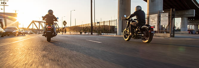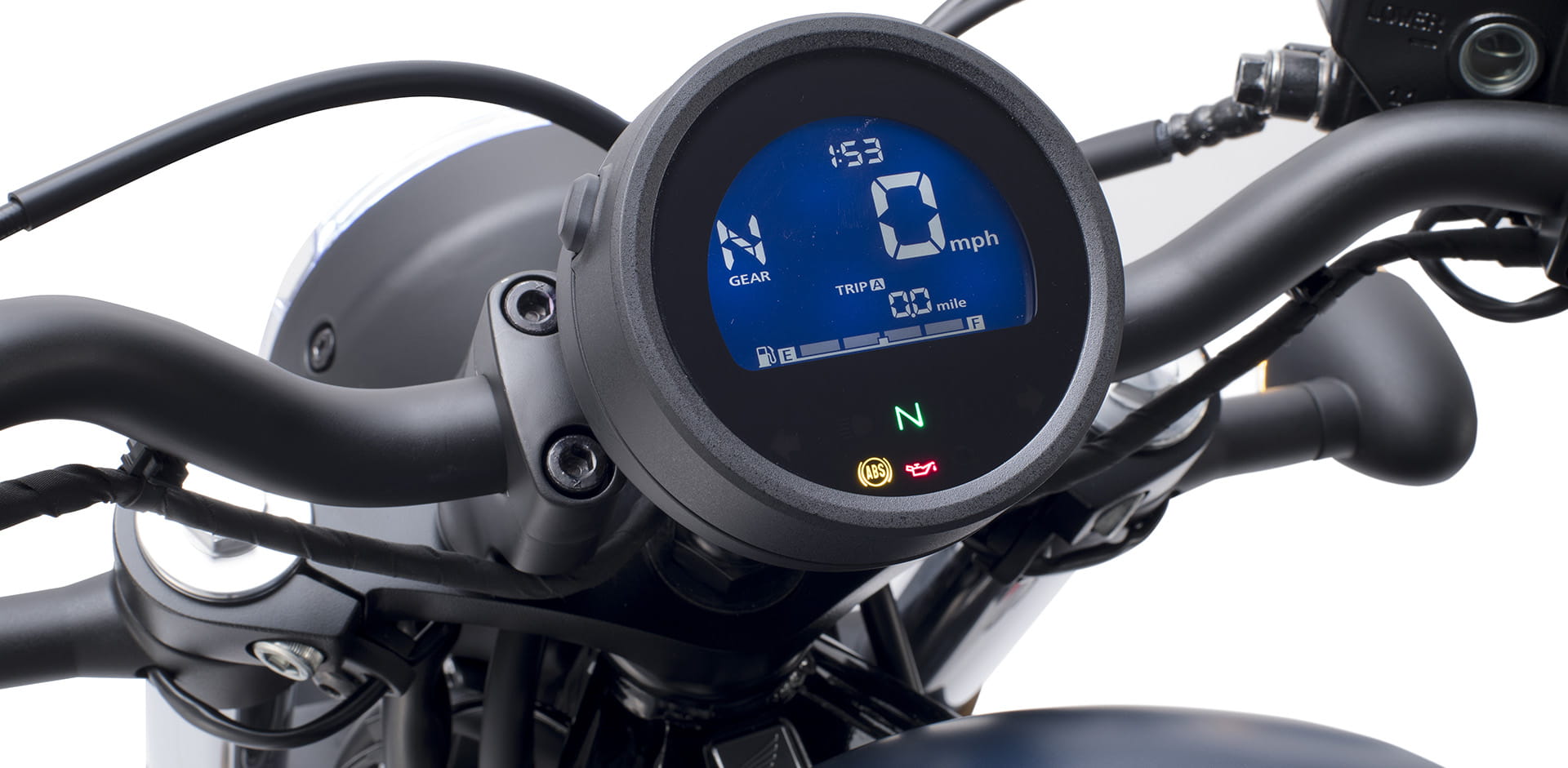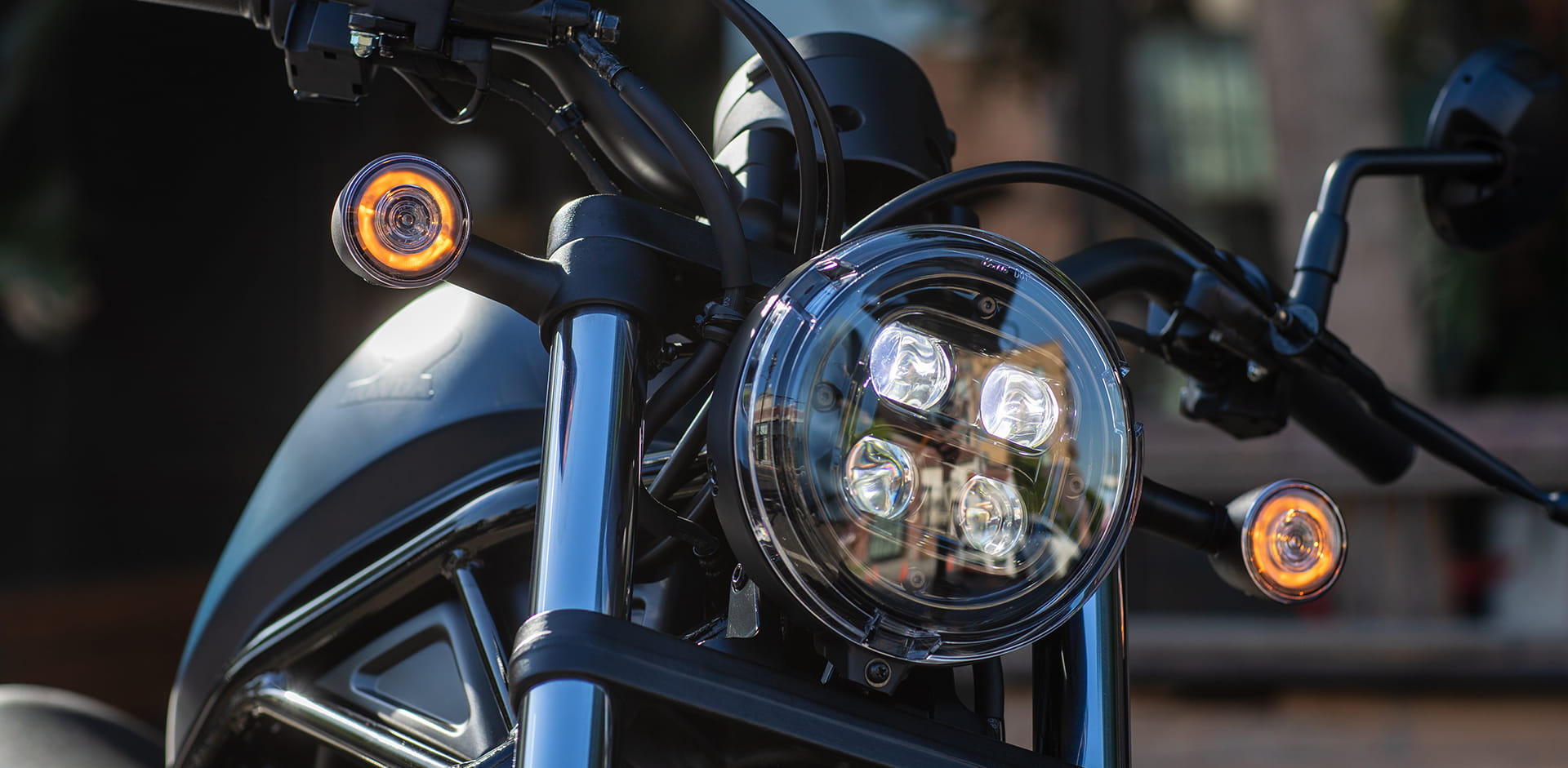 The rigid, low-slung tubular steel frame is central to Rebel style and hugely complemented by 16-inch diameter cast aluminium wheels with fat, 130/9-16 and 150/80-16 front and rear tyres. For a stripped-down look the pillion footpegs and rear seat pad quickly unbolt. 41mm telescopic front forks are matched to spring preload- adjustable, nitrogen-charged shock absorbers, for a compliant and supple ride; both front and rear discs are controlled by two-channel ABS, for confident braking in all conditions.