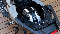 The X-ADV uses a new tubular steel frame that enables roomy under seat storage space married to a narrow 450mm wide rear seat unit. Rake and trail is set at 27°/104mm with wheelbase of 1588mm. A 39° steering angle (and turning radius of 2.8m) makes the X-ADV maneuverable in tight traffic. Long travel suspension, 153.5mm up front and 150mm from the rear – is matched to 162mm of ground clearance.