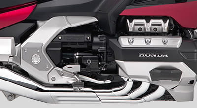 Stripping away the Gold Wing’s sleek bodywork reveals a fully honed chassis; a hugely strong, die-cast aluminium beam frame provides rock-solid stability, with steering precision and control from double wishbone front suspension. The single-sided rear Pro-Arm operates through Pro-Link, with electronically adjustable spring preload, and front and rear damping adjusts relative to riding mode selected. Dual Combined Braking System (D-CBS) distributes braking force evenly and with ABS control for confident, efficient stopping power. Hill Start Assist (HSA) makes getaways on an incline easy.