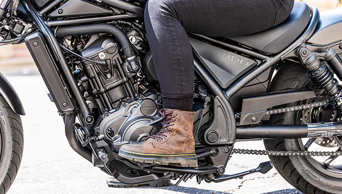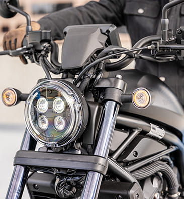 Also part of the Rebel family is the street custom chic of the CMX1100SE Rebel. It’s the first factory Honda to wear barend mirrors; these are a stylish, aluminium cut, antiglare design. Other factory-fit features include colour matched nose cowl, specially designed fork leg gaiters and short, sporty front mudguard. A diamond-stitch seat adds style and extra comfort while an anodised radiator cover marks out the SE difference.
