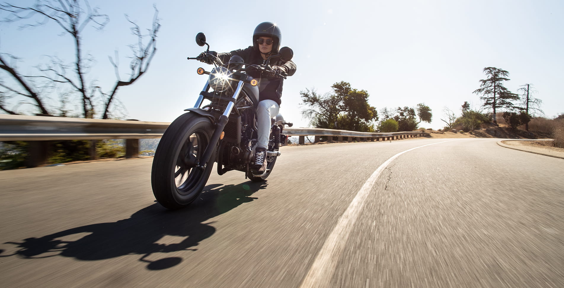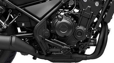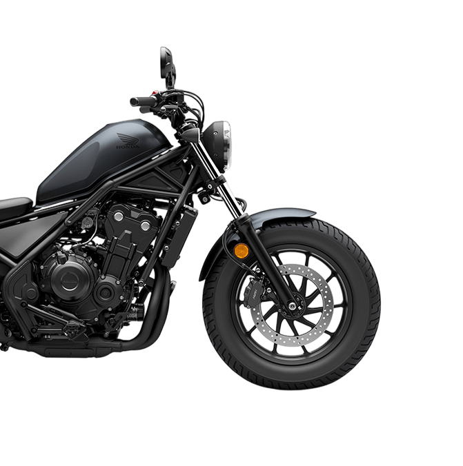 The rigid, low-slung tubular steel frame is central to Rebel style and hugely complemented by 16-inch diameter cast aluminium wheels with fat, 130/9-16 and 150/80-16 front and rear tyres. For a stripped-down look the pillion footpegs and rear seat pad quickly unbolt. 41mm telescopic front forks are matched to spring preload- adjustable, nitrogen-charged shock absorbers, for a compliant and supple ride; both front and rear discs are controlled by two-channel ABS, for confident braking in all conditions.