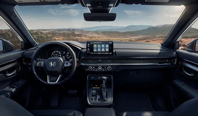 L'intérieur du CR-V e:HEV 2024 est sportif, moderne et spacieux, faisant progresser la nouvelle direction du design Honda, avec un savoir-faire raffiné, des matériaux et des touches haut de gamme. La toute nouvelle cabine est également plus silencieuse, plus spacieuse et dispose de plus de technologies, notamment des jauges numériques standard et des écrans tactiles plus grands.